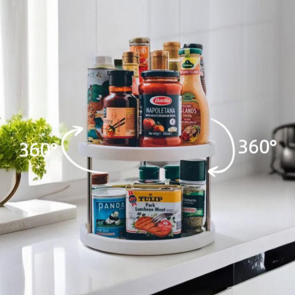 Keep your kitchen neat and organized with this 2-layer rotating storage rack, perfect for holding spices, condiments, sauces, cans, or snacks. With its compact, vertical design, it maximizes storage in small spaces while keeping everything easily accessible.