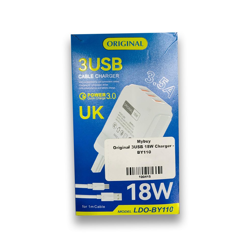 Power up to three devices at once with the Original 3USB 18W Charger BY110, a compact and efficient wall charger designed for modern multi-device users. Featuring three USB-A ports with intelligent power distribution, this 18W charger delivers fast and safe charging for smartphones, tablets, smartwatches, and other USB-powered devices. Its sleek design, reliable performance, and built-in safety features make it the perfect charging solution for home, office, or travel.