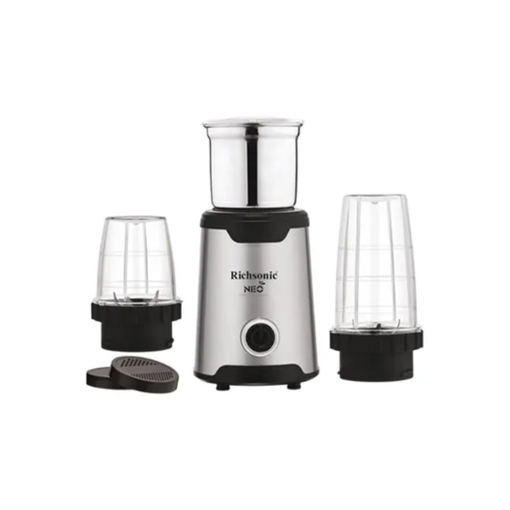 The Richsonic 3 in 1 Mix & Grind – RSMG2048 is a versatile kitchen appliance designed to simplify food preparation with three essential functions in one compact unit: mixing, grinding, and blending. Perfect for making chutneys, spice powders, smoothies, batters, and pastes, this powerful gadget features a high-speed motor, durable stainless steel blades, and multiple jars for different tasks. Ideal for small kitchens, bachelors, or quick meal prep, it delivers efficient performance with minimal effort.