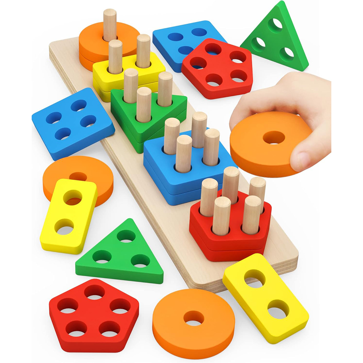• Includes 12+ wooden pieces: geometric blocks, stackable rings, pegs, and threading beads