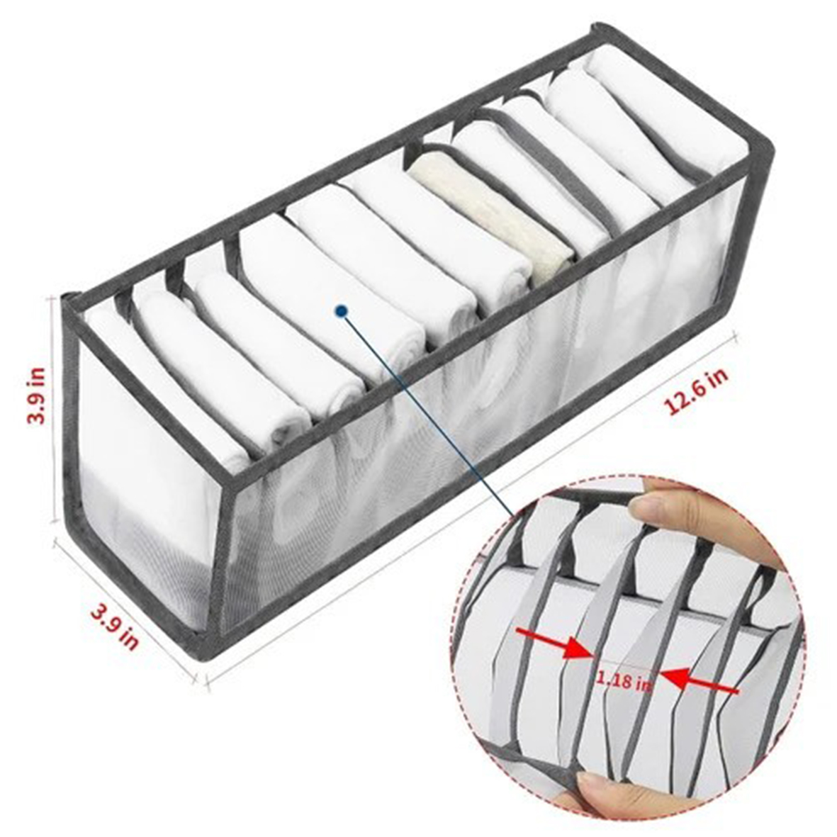 The 11-grid underwear and socks organizer is a foldable storage solution designed to keep your undergarments neatly arranged and easily accessible. Made from durable, breathable mesh, it helps maximize space and maintain an organized wardrobe.