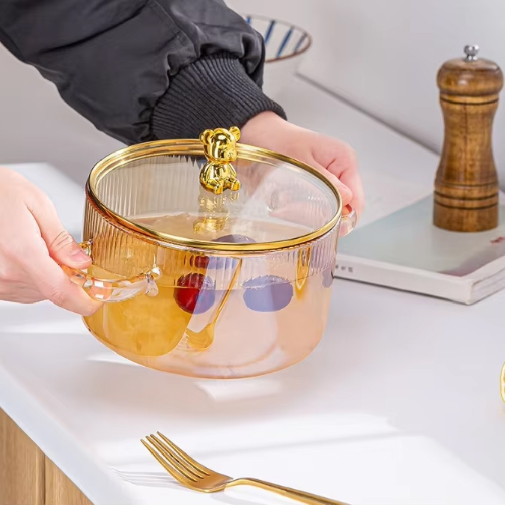 Avoid sudden extreme temperature changes (e.g., placing a hot pot on a cold wet surface). Do not use induction stoves unless equipped with a heat diffuser. Handle with care – glass may break if dropped or struck. Use oven mitts when handling hot. Not suitable for broiling or open flame.